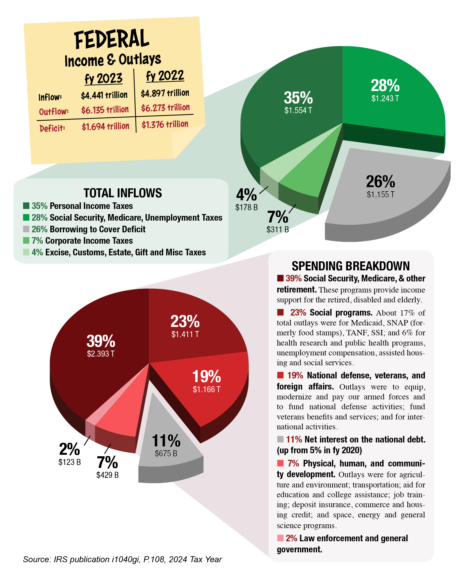 As required by law, in every Form 1040 instruction booklet there’s a section that shows where our federal government gets its money and where it is spent. As taxpayers it makes sense to know this information. Here is the data for the government’s fiscal year ending September 30, 2023, as reported by the IRS in the 2024 instruction booklet for Form 1040:
